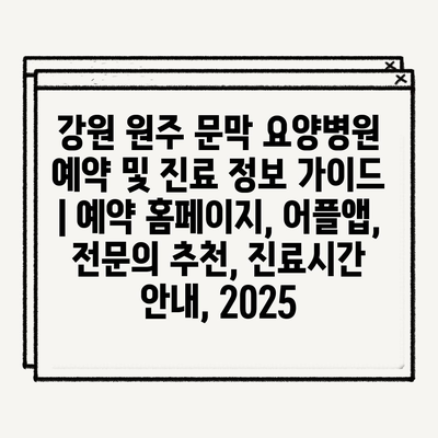 강원 원주 문막 요양병원 예약 및 진료 정보 가이드 | 예약 홈페이지, 어플앱, 전문의 추천, 진료시간 안내, 2025